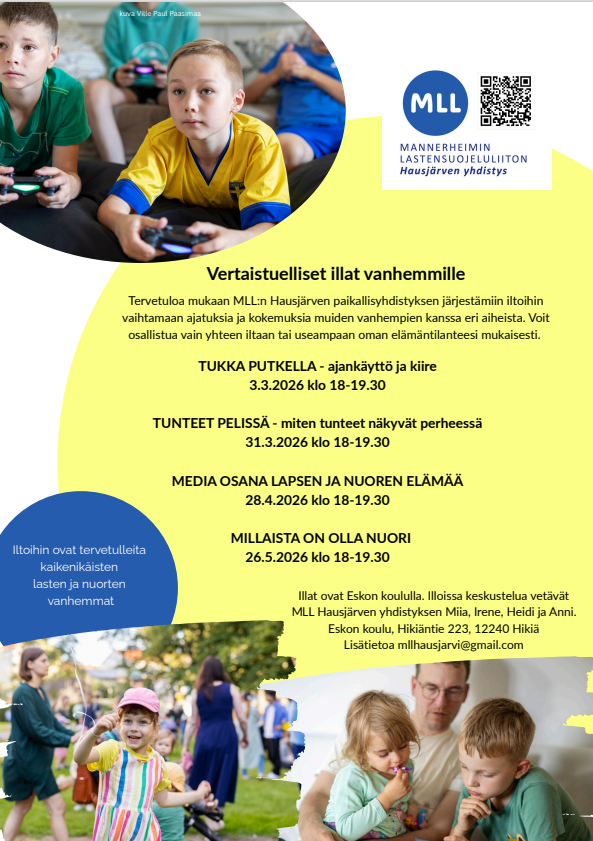 Illat ovat Eskon koululla. Illoissa keskustelua vetävät MLL Hausjärven yhdistyksen Miia, Irene, Heidi ja Anni. Eskon koulu, Hikiäntie 223, 12240 Hikiä Lisätietoa mllhausjarvi@gmail.com